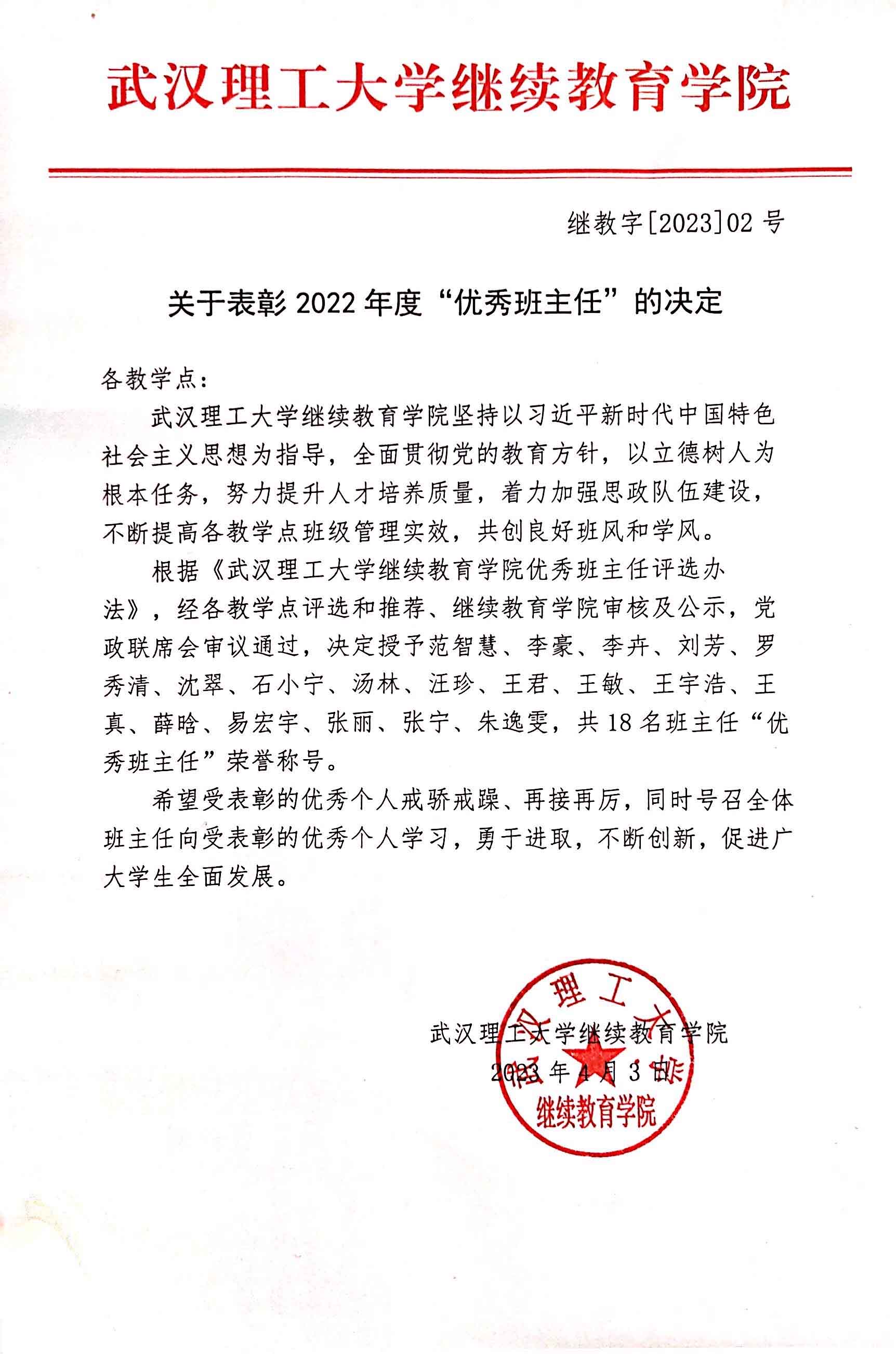 2023年4月6日武漢理工大學(xué)繼續(xù)教育學(xué)院對于2022年度‘優(yōu)秀班主任’進(jìn)行表彰嘉獎(jiǎng),我校朱逸雯老師,有幸獲得“優(yōu)秀班主任”稱號,得到學(xué)校的認(rèn)可。