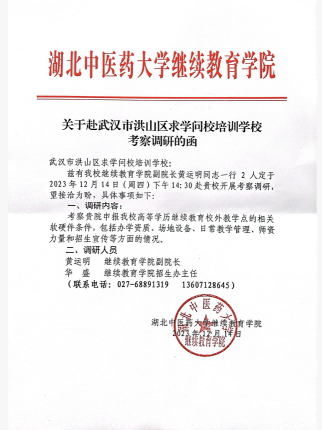 2023年12月14日下午14:30時(shí),湖北中醫(yī)藥大學(xué)繼續(xù)教育學(xué)院副院長(zhǎng)黃運(yùn)明,繼續(xù)教育學(xué)院招生辦主任華盛,蒞臨我??疾煺{(diào)研工作,求學(xué)問(wèn)校校長(zhǎng)鄧健,副校長(zhǎng)周威,對(duì)湖北中醫(yī)藥大學(xué)繼續(xù)教育學(xué)院領(lǐng)導(dǎo)一行表示熱烈的歡迎,并全程陪同接待,參觀本校。